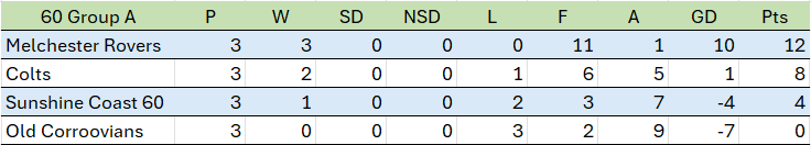 | M40 | 3.30PM | Colts | 4 | 1 | Sunshine Coast 60 | 5 |