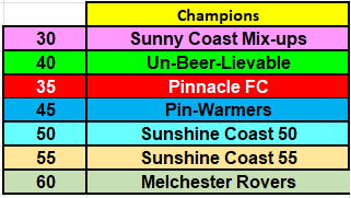 | Sunny Coast Mix-ups | 4 | 3 | 0 | 1 | 0 | 12 | 0 | 12 | 13 |